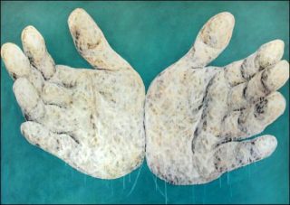 «La peinture de Feng Ge ne retranscrit aucune de ses observations. Peut-être qu’au moment où la peinture liquide trace une verticale en coulant, Feng observe le dessin qui se fait seul. Ses tableaux sont réalisés dans une gestuelle ample, souvent très physique. Les grandes mains peintes sur fond de lumière occupent un espace de lévitation sans aucun prolongement morphologique. Souvent par couple, et malgré leur taille, elles ne semblent pas menaçantes. Elles sont pleines de symboles. Les gestes de la peinture de Feng Ge s’approprient des sujets et en font des formes. Feng est très concerné par la question de l’énergie de la pensée et des gestes et de leur achèvement pictural. Cette énergie demeure dans cet entre-deux, du geste et du résultat peint qui se fige. Elle nous parle aussi du vide, du provisoire et du plein.»