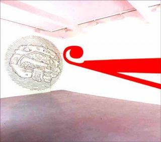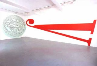 Son Y rouge flirte ici avec un disque vert qui délimite un territoire de forêt de château fort. Le lieu d’exposition lui sert de passerelle vers de tels univers inventés ou réécrits.
