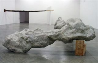 — Julien Dubuisson, Visite extérieure d’une grotte, 2010. Ciment-résine, bois. 650 x 350 x 150 cm (diamètre 90cm).