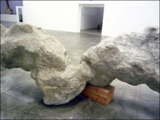 Julien Dubuisson. En parallèle de sa fabrication, je menais une réflexion sur un geste élémentaire de la sculpture, le moulage. J’ai choisi le ciment car j’aime la sensation de ce matériau quand il est coulé. Mais dans cette sculpture, ce n’est justement pas le cas! Je voulais laisser planer le doute, et que le public se demande si la sculpture a été moulée ou bien travaillée en direct.