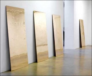 Dans la salle principale de la galerie, six «portes» en bronze posées sur un mur entrent en écho avec quatre «portes» en marbres appuyées sur le mur en vis-à -vis.