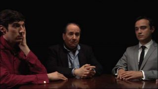Le spectateur rechigne bien sûr à endosser aussi abruptement un tel questionnement existentiel. Qui se révèle être au cœur du dialogue qu’entretiennent les six personnages de la vidéo projetée en contrebas : quatre hommes, un jeune et un plus âgé, deux autres semblables, même allure, même coiffure, même costume gris et cravate noire, assis face à face en miroir, une femme et un garçonnet, réunis autour d’une table circulaire, dans une pièce noire, baignée d’une lumière caravagesque.