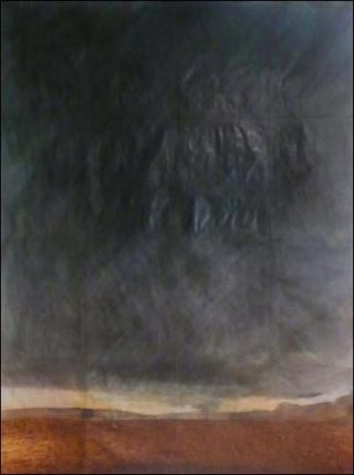 — Une affiche de cinéma originale, retouchée au crayon pour en supprimer les informations et gommer les détails publicitaires, devient la représentation d’un paysage quelconque.