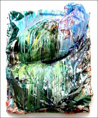 Dans cette effusion chromatique, dans ces procédures acharnées contre la toile, se décèle une obsession plus organique que plastique. Ces toiles s’affirment comme des « morceaux » de peinture façon pièces de boucher (que l’on se rassure nous n’irons pas jusqu’à citer le XVIIe siècle). Les déformations de la toile alourdies comme les lambeaux de couleur écorchée nous rappellent une peinture préoccupée essentiellement par la chair. Sans doute le drapé plus maculé que mouillé participe-t-il également de cet « appel », de cette sorte d’obsession.