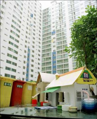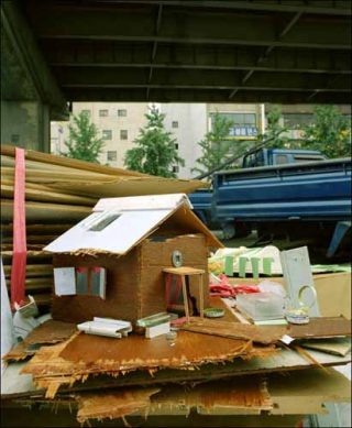 J’investis le lieu choisi, le modifie par l’apport en premier plan de quelques objets dont le positionnement respecte une logique de perspective. Se crée alors l’illusion que ces modèles réduits posés tout contre l’objectif sont de même dimensions que les objets réels du second plan. Le spectateur est dupé sur la taille réelle des sujets photographiés, par l’interprétation erronée de sa perception sensorielle. Cependant tout est mis en œuvre pour que le doute subsiste. Quelques aberrations l’interpellent et sa logique perceptive est faussée. Les modèles réduits, qu’ils soient fabriqués sur place ou rapportés, achetés dans les commerces de maquettes ou de jouets, ne sont jamais la miniaturisation exacte de ce qu’ils tentent de représenter. Les imperfections sont autant d’indices qui nous font douter de ce que cette composition voudrait nous faire croire… Mirage du bonheur.