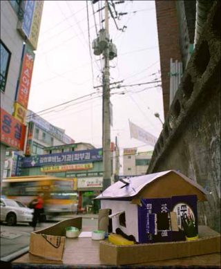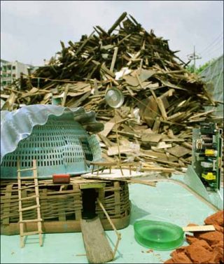 Édouard Sautai : Si mes constructions sommaires évoquent les habitations de fortune des sans-abri, elles sont surtout apparues avec les voyages. Ce sont tout d’abord des abris de nomade. Lorsque vous êtes en déplacement lointain dans une culture très différente de la vôtre, il faut s’installer quelque part.