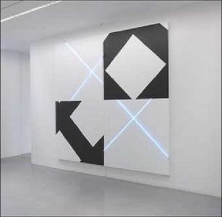 Dans l’apparente déconstruction des lignes de néons sur fond blanc, la forme semble reprendre sens, dans le cadre serré de la toile. Ici peinture et lumière se rejoignent, liant ainsi deux médias de l’art cinétique et de l’art minimal. Peinture et néons dialoguent avec l’architecture des lieux.