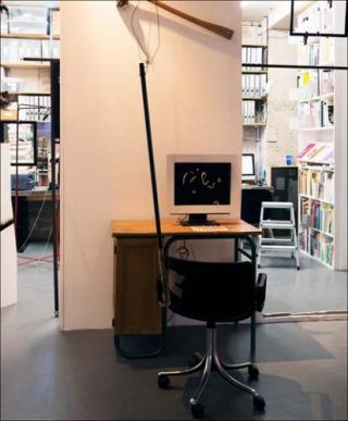 Quand il entre dans l’espace de la galerie, le visiteur voit une accumulation d’objets autour et à l’intérieur d’un espace évoquant une situation de travail de bureau. Ces articles semblent un peu démodés et ils sont assemblés dans une sorte de scénographie.