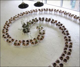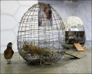 Leur présence remet en question notre rapport à l’animal et à l’Autre. Le dispositif créé pour ces poules au rez-de-chaussée de la galerie reproduit les conditions d’une «société». Dans cette société, on a 4 poules de Marans, 1 poule Araucana pour 4 lieux de ponte. Maria propose aux poules un lieu commun soit le perchoir, le poudroir et la cantine, ainsi que des nids individuels en forme d’œufs.