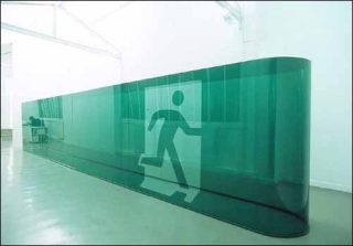 Son fonctionnement a ce coté systématique doublé du souci constant du contexte qui anime ses installations. C’est par ailleurs cet engagement qui l’entraîne bien souvent à réinterpréter sans cesse quelques unes de ses pièces pour les adapter à l’espace qui les accueille. Preuve en est Leica (2004), couloir en plexiglas bleu à échelle humaine doublant la longueur et la frontalité de la baie vitrée de la galerie. S’imposant comme une sculpture, cette œuvre invite à parcourir l’espace qu’elle couvre, non sans développer une certaine séduction esthétique. Le chemin qu’elle décrit nous est suggéré par un logotype d’issue de secours qui se trouve à l’extrémité de la pièce. Cette idée de course et de fuite s’inscrit comme le leitmotiv de cette présentation dans la galerie. Notre fuite est cependant bloquée par la fascination de l’objet à la fois étrange et étranger.
