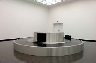 — Uncollected, 2005. Aluminium, bois, plastique, bagages. H.100 cm, ø 400 cm