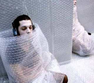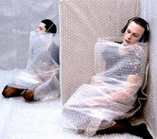 L’espace dédié à la performance, une pièce d’une vingtaine de mètres-carrés, est entièrement recouvert, des murs au plafond, de plastique d’emballage constitué d’une multitude de bulles d’air qui explosent sous nos pas. Cinq hommes et femmes en tee-shirt et collants, assis ou allongés par terre, sont emballés jusqu’au cou du même plastique à bulles. Leur maquillage est très blanc et ils portent sur leur tête un casque d’écoute. Leurs yeux sont fermés ou fixes. On entend une musique très contemporaine composée par Benedikt Schiefer. Cette musique est constituée de phrases en anglais, en français et en allemand, de chants d’oiseaux, de sons aigus obtenus en frottant du doigt les bords d’un verre, de voix qui résonnent, de bris d’objets en verre, d’un lointain air de ukulélé, de résonances, d’explosions. Le tout créant une atmosphère assez new-age, étrange et agréable, dans laquelle on se sent comme en apesanteur. L’atmosphère est très concentrée. Certains visiteurs marchent dans la pièce, d’autres se sont assis par terre.