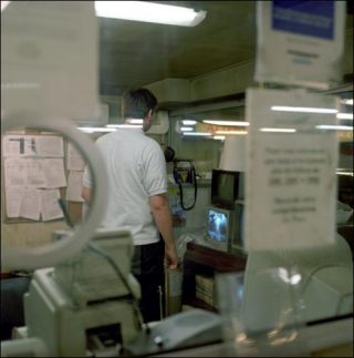 Autre «corpus» de son approche, celui des travailleurs anonymes enfermés dans ces cages de verre, vitrines, espaces clos ou restreints des grands ensembles architecturaux. Pions anonymes posés là comme des sculptures de chair avec pour unique fonction d’accueillir les visiteurs ou de préserver la tranquillité des espaces intérieurs qui s’ouvrent derrière eux, parfois à travers un reflet ou un écran lumineux, qu’ils soient parkings, bureaux, sièges, cabines ou postes de renseignements divers. Cet ensemble de figures pris sur le vif rejoint sa mise en espace des trottoirs aux installations vacantes, en ce qu’elle apporte de l’attention à ce qui n’est jamais remarqué (ou peu remarquable).