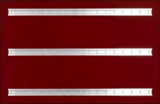 Aux murs, les Strap Paint correspondent à des rectangles rouges en bois au centre desquels ont été intégrées des bandes en aluminium. Ces signaux dessinent au mur des formes de blasons rougeoyants.