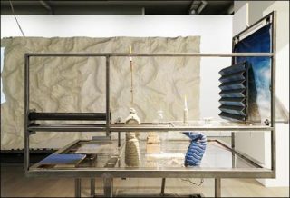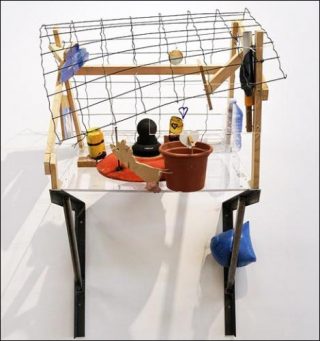 Mais si Brune Renault peut déstabiliser son spectateur à plus d’un titre, le reste de l’exposition n’en demeure pas moins déroutant. Deux grands bureaux faits de bric et de broc occupent la première salle de la Fondation Ricard. Leurs arêtes de métal et leur plateau de verre peuvent tout d’abord nous rappeler l’habitacle de la voiture aperçue dans le court-métrage. On y discerne quatre éléments récurrents symbolisant les quatre personnages que sont Prune, Lucie, Sylvain et Fabien: une cigarette, un pot de fleur, une bouteille et une canette. Neïl Beloufa souligne également que ces drôles d’installations sont destinées à être manipulées par les spectateurs.