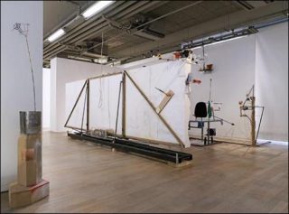 Cette manière de mêler l’art et le fonctionnel, les domaines du beau et de l’utile, se retrouve dans deux autres installations qui ponctuent le parcours de l’exposition: des portes battantes reliées à des compteurs enregistrant (et truquant) le nombre de fois où elles ont été ouvertes, et une énorme masse servant à ratatiner des tubes métalliques, dont la silhouette filiforme rappelle les cigarettes de Prune omniprésentes tout au long de l’exposition.