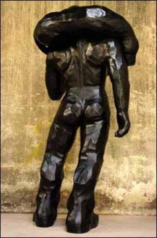 L’impression d’anonymat est renforcée lorsque l’artiste choisit de recouvrir entièrement ses sculptures de résine polyester noire.
