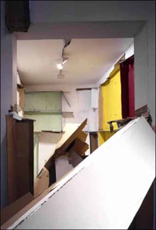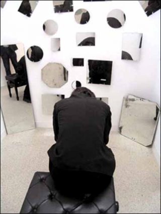 Dans un recoin du Plateau, Noé Sendas a placé un homme vêtu de noir, la tête dans ses mains, qui tourne le dos aux visiteurs (Versus, 2005). Face à l’homme qui nous cache son visage, apparemment empreint d’une mélancolie morbide, plusieurs miroirs aux formes géométriques variées sont accrochés au mur.