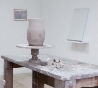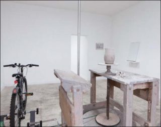 Le ton pourrait rester celui de la plaisanterie, si l’exercice n’impliquait pas un tissu relationnel complexe. L’installation Vase en terre caressé par une danseuse acrobatique, moulé par un potier sur un tour mû par un cycliste (2010-2011) explicite de façon théâtrale cette idée. Destinée à être mise en action au cours d’une performance, elle réalise l’union de trois professionnels (une danseuse, un potier et un cycliste) dans une sorte de chorégraphie sans fin où chacun s’adonne à son savoir-faire personnel tout en concourant, par sa force de travail, à la bonne marche de l’ensemble. Entre gag et sublimation, cette installation interroge la relation de l’homme à la machine.