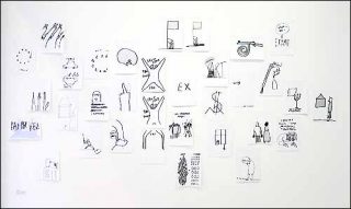 Le dessin de Dan Perjovschi ne se fait que dans l’urgence: c’est un trait rapide et incisif qui libère une pensée, un argument, une remarque, peut-être un constat mais jamais une synthèse définitive, plutôt une formulation critique et fragmentaire de l’état du monde.