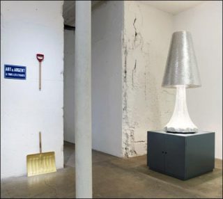 — Hans Haacke, Broken R.M, 1986. Plaque émaillée, pelle à neige dorée. Dimensions variables