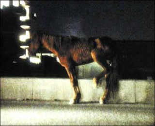 L’image, dont le grain est visible, est très picturale — l’artiste était peintre avant d’arriver à Paris —, minimale, et devient à certains moments floue, presque abstraite. De manière répétitive, des véhicules passent, dont on entend le bruit, violent, et dont on voit passer le trait de lumière. Le cheval, mourant, recourbe alors une de ses pattes, comme s’il cherchait à se protéger, inexplicablement déplacé dans ce milieu qui lui est hostile.