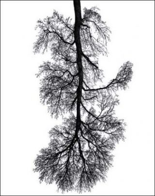 Les représentations d’éléments naturels détachés de leurs contexte adoptent, quant à elles, une dimension plus conceptuelle: l’arbre nu est placé la tête en bas, en un simple aplat noir sur blanc sans volume; d’autres branchages également à l’envers sont semblables à des coulures d’encre. Par leur décalage, ces photographies cherchent à répondre à la question de savoir quelles sont les représentations possibles, à l’échelle humaine, de l’infini de l’univers et de son mouvement perpétuel?