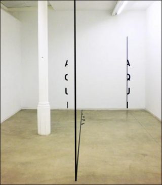 Peter Downsbrough, artiste de la simplicité et du dénuement, structure l’espace en créant des volumes discrets à l’aide d’un vocabulaire plastique épuré, constitué de figures géométriques simples, de lignes et de mots. Il réalise une intervention dès l’entrée du musée pour nous guider dans l’espace d’exposition. Son processus de coupure optique, de recadrage du champ visuel, suggère une nouvelle appréhension de l’espace. Les mots dispersés, des allocutions (encore, là , et, vers, as, but, and…), invitent à chercher au-delà du champ visuel. Son intervention révèle un intervalle ouvert qui se modifie en fonction des points de vue, parle de place, de placement et de déplacement.