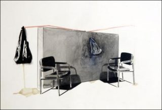 Les peintures de Farah Atassi figurent des intérieurs, pauvres et désertés, structurés par des lignes géométriques — dortoir, salle d’attente, cuisine, salle de bain, atelier… — les plus récentes sont réduites à une mosaïque de petits carreaux recevant des constructions à l’échelle indécise, entre jouets d’enfants et architecture moderniste. Ces tableaux de grands formats, sans présence humaine, génèrent une incertitude. Le regard est éprouvé devant ces espaces clos dans lesquels les plans semblent se replier, les perspectives se perdent, les distances restent indéfinies mais où les strates et repentirs sont laissés visibles.