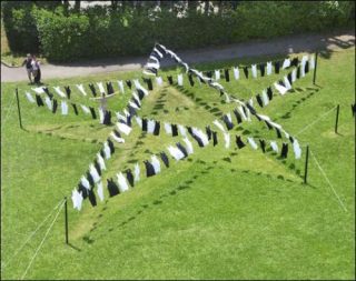 En suivant ce parcours, on se rend progressivement compte que le visiteur est mis dans une position comparable à celle de l’étudiant: il s’agit d’accepter de se laisser mener quelque part. Noël Dolla insiste en effet sur la conception d’un enseignement qui s’évertue à être un programme d’émancipation: donner des outils et non pas des dogmes. A ce titre, sa pièce Tous les mots du monde (2013), une structure en inox qui se dresse du haut de ses 9 mètres sur la terrasse inférieure, et où miroitent au soleil les 26 lettres en laiton de l’alphabet, en est une parfaite illustration: la potentialité pré-langagière à l’état brut.