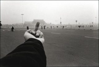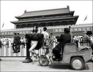 La photographie touristique est ainsi transformée en micro performance éphémère. Juin 1994, place Tiananmen, devant le portrait de Mao, selon le rituel profane du «j’y étais», la compagne de Weiwei tout sourire relève sa jupe, pour découvrir la blancheur rayonnante de sa petite culotte en un pied de nez subversif et furtif, qui déjoue la vigilance des gardiens du Temple.