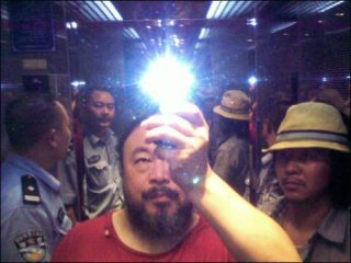 — Ai Weiwei avec la rockstar Zuoxiao Zuzhou dans l’ascenseur, placé en garde à vue par la police Sichuan, Chine, août 2009