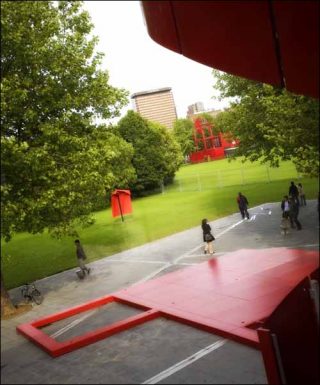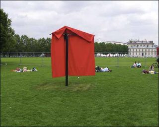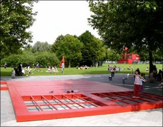 Le rouge qui marque fortement la sculpture de Christophe Cuzin, le gonflable de Hans-Walter Müller et les trois voiles de Ursula Achternkamp, rappelle celui des Folies de Bernard Tschumi. Ces vingt-cinq Folies, constructions permanentes du parc, opposent leur rouge vif au vert des pelouses. Espacées de 120 mètres, elles construisent dans le parc une séquence, un rythme, une régularité visuelle.