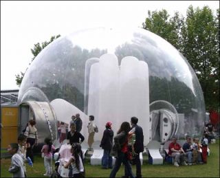 Le corps se déplace au cœur des œuvres elles-mêmes: le gonflable est un véritable microcosme. Le traverser revient à faire l’expérience d’un univers singulier dont l’atmosphère détonne par rapport à celle du parc. Ce globe d’allure fragile établit le règne du mouvement et de l’air contre celui de l’immobilité des architectures pérennes et dures. Pourtant, l’enveloppe du gonflable en plastique transparent empêche le visiteur de s’extirper absolument du monde du parc. Une coexistence étrange travaille les limites du regard. En traversant Au bord de l’air, on découvre un univers particulier tout en restant dans le parc. Le regard est perturbé par la transparence de la frontière.