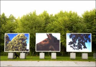 Jeux de parcours, de déambulations, de distances et enfin jeux d’entre-deux. La photographie d’âne de Jean-Luc Tartarin, au centre d’un triptyque de panneaux publicitaires, oppose la force primitive de la nature à l’ambivalence du parc, semi-urbain, semi-naturel.