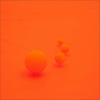 Des sphères de polystyrène ponctuent la surface fluorescente dont elles adoptent la couleur jusqu’à se confondre avec elle ou au contraire arborent un vert vif qui tranche franchement avec le rouge orangé ambiant. De volumes variés, elles s’élèvent plus ou moins de la surface : ici posées sur de courts supports, là suspendue dans l’air. Tracés à l’encre de Chine, deux larges dessins insèrent leurs motifs abstraits dans la couleur du sol, tels deux îlots parfaitement délimités.