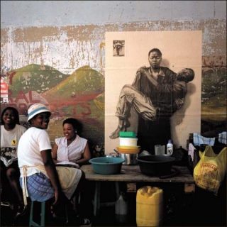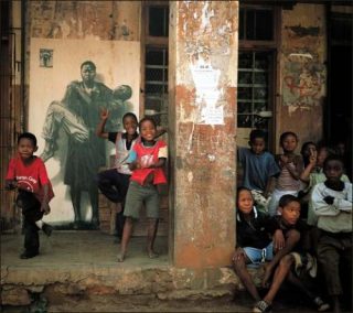 A Nice, ville alors jumelée avec la capitale d’Afrique du Sud, Ernest Pignon-Ernest affiche le dessin d’une famille noire derrière des barbelés pour dénoncer la politique de l’Apartheid.