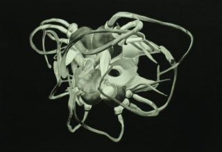 C’est dans une même vision ambiguë que s’inscrit la série Plastiniliasis. Sur des toiles de petits formats sont dessinées à la pierre graphique des formes embryonnaires plus ou moins sphériques. L’objet en noir et blanc apparaît par contraste sur une toile assombrie à la pierre graphique, ce qui valorise son relief. Chaque «corps» semble en suspension dans un espace indéfini et illimité, le noir étant par définition — en tant que non couleur — une expression du néant. L’unicité de l’objet dans la toile et le fond noir en font un sujet d’observation et d’attention. Là aussi l’identification est difficile, on pense à des micro-organismes cellulaires ou à des extra-terrestres. Le sujet ainsi non identifié provoque un sentiment de mystère, voire d’inquiétude.
