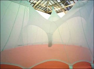 Ernesto Neto nous propose ici d’être au centre d’une architecture redessinée. Il nous incite à devenir acteur et spectateur d’un court instant plastique en train de se construire.