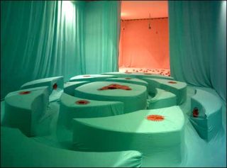 On longe, on contourne, on cherche l’entrée, attiré par les rires et les dialogues qui s’échappent de ces caissons fragiles et clos. Une fois à l’intérieur nos sens sont immédiatement sollicités. Pieds nus, sur un sol meuble, nous sommes invités à fouiller d’une main indiscrète et méfiante des cavités opérées dans des blocs de mousse. Différents épices diffusent leurs parfums au fur et à mesure de l’exploration.