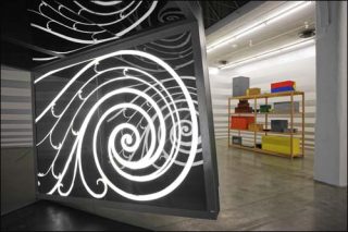 Dans la salle centrale de l’exposition, confiée aux soins de John Armleder, on trouve d’abord une peinture murale terminée en 2008, qui fait ainsi le lien avec notre époque, de même que la peinture murale de Günther Förg dans la Rue réalisée pour l’exposition.