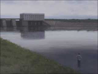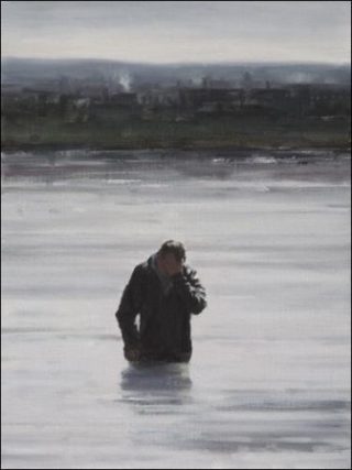 Certaines toiles sont véritablement énigmatiques, et assez désespérées. Dans Narcis, un homme se tient debout dans l’eau. Derrière lui: une ville, sans que l’on sache très bien si les fumées qui s’en échappent viennent des usines ou d’un incendie que l’homme constaterait, impuissant.