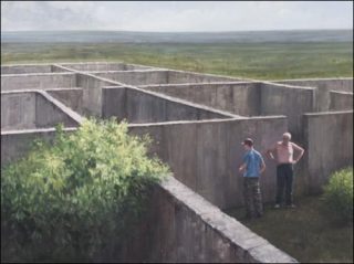 Dans Labyrinth, deux hommes se tiennent passifs au centre d’une construction improbable aux de murs bruts, sans toit, envahie par la végétation, située au milieu de nulle part.