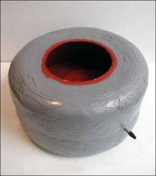 Tel est le cas pour l’œuvre de Van Lieshout dont le Sensory Deprivation Helmet (1999) accueille les visiteurs à l’entrée de la galerie. Ce gros casque en fibre de verre renforcé (un matériau appelé «orgone») sert de chambre ou de sas de décompression si l’on y met la tête: un passage obligé à qui veut faire le vide sensoriel (sensory deprivation), puis se ressourcer et recouvrer son énergie grâce à l’effet thérapeutique du matériau sphérique de couleur grisée. Influencé par la pensée de Wilhelm Reich, par son «orgone therapy» et son érotisme latent, Van Lieshout a conçu des «machines organiques» ou cellules pour se détendre, se calfeutrer et se cocooner, qu’il a déclinées en des versions portables de tailles diverses, depuis des Skulls ou pièces en forme de sphère où le corps se niche et se love en une attitude fœtale, jusqu’aux Chambers de plus grandes dimensions pouvant accueillir plusieurs personnes.