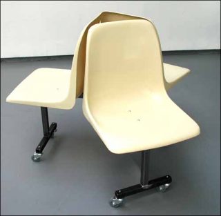 Un autre meuble, non statique cette fois, est exposé: les Chaises de Veit Stratman dont il avait proposé diverses versions, tels Les Anneaux et La Chaîne des chaises en 1999, et Les Tourniquets d’Enghein en 2000. Trois sièges-baquets en plastique jaune se font dos. Ces chaises mobiles, posées sur des roulettes, peuvent être «poussées dans les rues par des amis qui s’amusent», aime à imaginer le designer. La vie sociale, pour lui, est tributaire de la forme des mobiliers publiques qui conditionnent notre comportement, nos échanges et nos mouvements.