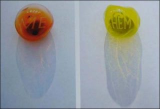 Que l’œuvre retienne en sa matérialité le corps et le souffle mêmes de l’artiste, cela s’exprime encore dans Primary Blows / Blown Glass de Seamus Farrell, composée de quatre ampoules qui auraient été obtenues par une seule expiration d’un souffleur de verre. Placée sur quatre murs, chaque ampoule porte en inscription la gravure d’un pronom anglais — «Me», «Him», «Them», «You» —, et deviendrait ces mots-objets soufflés, devenus des paroles gelées, en attente du souffle du spectateur.