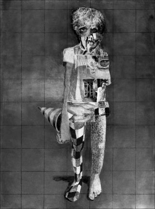 Le dessin Pierre-François #10 représente le personnage assis sur un lit ; sa taille fait deviner qu’il est désormais adolescent. Mais il apparaît comme une créature composite : d’une jambe à l’autre, il ressemble à un adolescent vêtu d’un jogging, puis à un personnage de la Commedia de l’arte ; un de ses bras rappelle le trait de Picasso, tandis que des morceaux de visages aux dimensions incohérentes lui forment une figure rapiécée. De quoi refléter l’âge ingrat et le mal être qui en découle, tant corporellement que mentalement. Ces superpositions donnent l’impression de collages, bien qu’il s’agisse de dessins faits au fusain et à la mine de bois, qui démontrent une nouvelle fois la grande maîtrise technique de Jérôme Zonder.