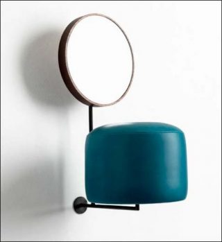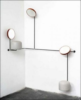 Avec Hau den Lukas, mailloche ou jeu de l’homme fort, Thomas Grünfeld s’emploie à l’association contre-nature d’un coussin en cuir avec un miroir rond cerclé d’un fin cadre de bois en les reliant par une barre de métal, évoquant ainsi de manière abstraite les jeux de force populaires des fêtes foraines tout en remplaçant le levier, la tour et la cloche, leurs composantes caractéristiques. La forme à laquelle il a abouti contenait les éléments de base d’une coiffeuse, puis elle a cédé la place à des systèmes plus complexes, réunissant jusqu’à 3 ou 4 tandems dans une prolifération ludique de combinaisons, ce qui lui permet de juxtaposer différentes versions de cet assemblage en termes de hauteur et de position. Ces variations évoquent un mélange entre une armoire et un buffet où on pourrait déposer quelque chose.