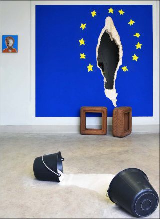 Artiste congolais et commissaire de l’exposition, Aimé Mpane interroge quant à lui les symboles de l’Union européenne et leur origine religieuse. Les douze étoiles de son drapeau, ainsi que sa couleur bleue, rappellent en effet les représentations de la Vierge Marie. L’installation Nguna (2018-2020) comprend ainsi une peinture du drapeau de l’Union, réalisée sur un mur fendu d’une brèche qui prend la forme de la Vierge. Devant la peinture, des pneus carrés jonchent le sol, arborant l’inscription « Pacification, Démocratie, Traités et Justice ». Des principes qui ont du mal à rouler, d’après l’artiste.