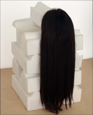 L’artiste John K. Cobra, né d’un père belge et d’un père congolaise, aborde quant à lui les conséquences corporelles de la colonisation à travers l’artifice de cheveux synthétiques. Sa sculpture Sans-Titre (2020) se compose ainsi d’une pile de blocs sculptés en caoutchouc, surmonté d’une perruque de cheveux lisses. Symbole des canons de beauté occidentaux imposés aux femmes africaines, cette perruque contraste ironiquement avec l’évocation des monuments et bâtiments emblématiques construits en Belgique grâce à l’argent obtenu des cultures de caoutchouc au Congo. Deux héritages différents issus de l’époque coloniale…